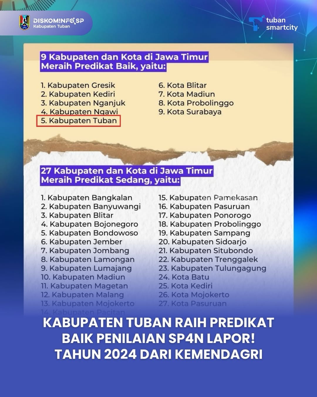 Kabupaten Tuban Raih Predikat Baik Penilaian SP4N LAPOR! Tahun 2024 dari Kemendagri